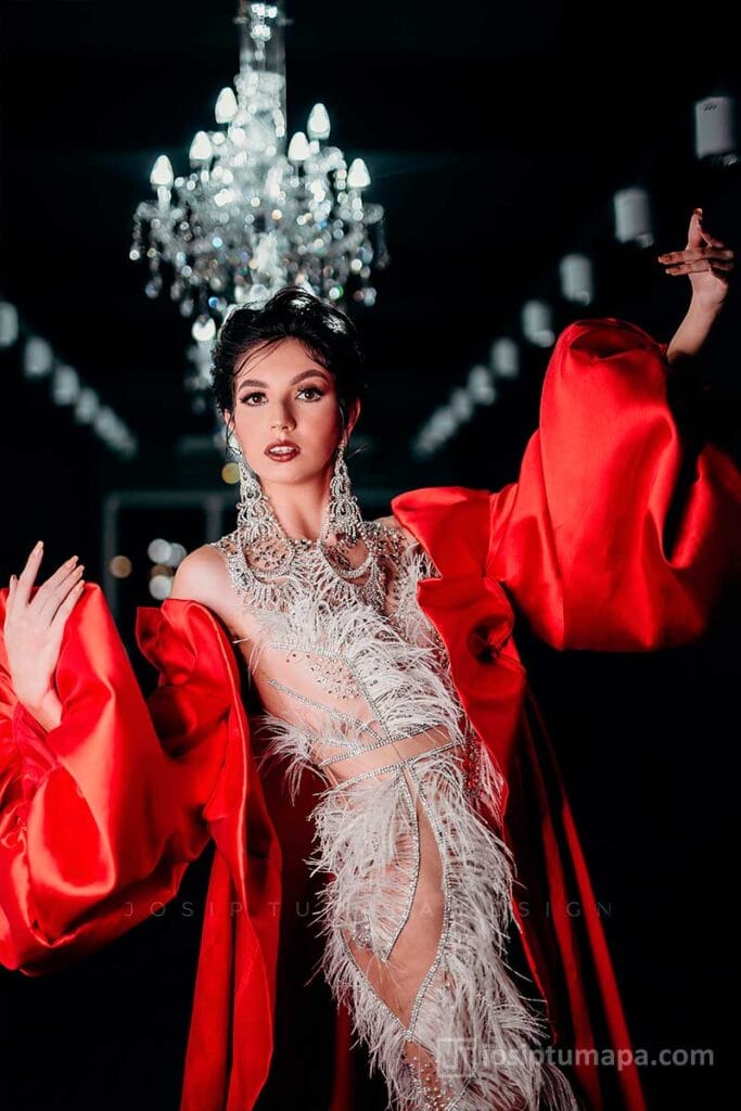 The contrast between the precise inner silhouette and the flowing outer layer creates a controlled tension that defines the character of the piece. Fiery Plume is designed for evenings when presence matters more than display — relying on movement, texture, and clarity of form rather than spectacle.