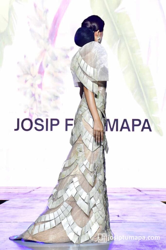 Ivory Light Filipiniana is built around controlled vertical construction and layered geometry. The silhouette follows a clear downward rhythm, allowing the dress to remain visually light while maintaining definition on the runway.